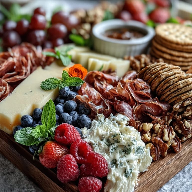 This board pairs wonderfully with a crisp white wine or sparkling rosé. Garnish with fresh mint leaves for an added burst of color and freshness that complements the fruits and cheeses perfectly.
